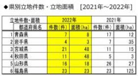 2021~2022年の宮城県の工場の立地件数は21件、立地面積は48haです。東北地方の工場立地の業種は生産用機械・食料品関連が多くなっています。