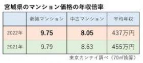 宮城県は、新築マンションで9.75倍(前年9.79)、中古マンションで8.05倍(前年8.63)となっています。平均年収が減少するなかで、宮城県の新築マンションは平均倍率は新築はほぼ横ばい、中古はやや縮小しています。
